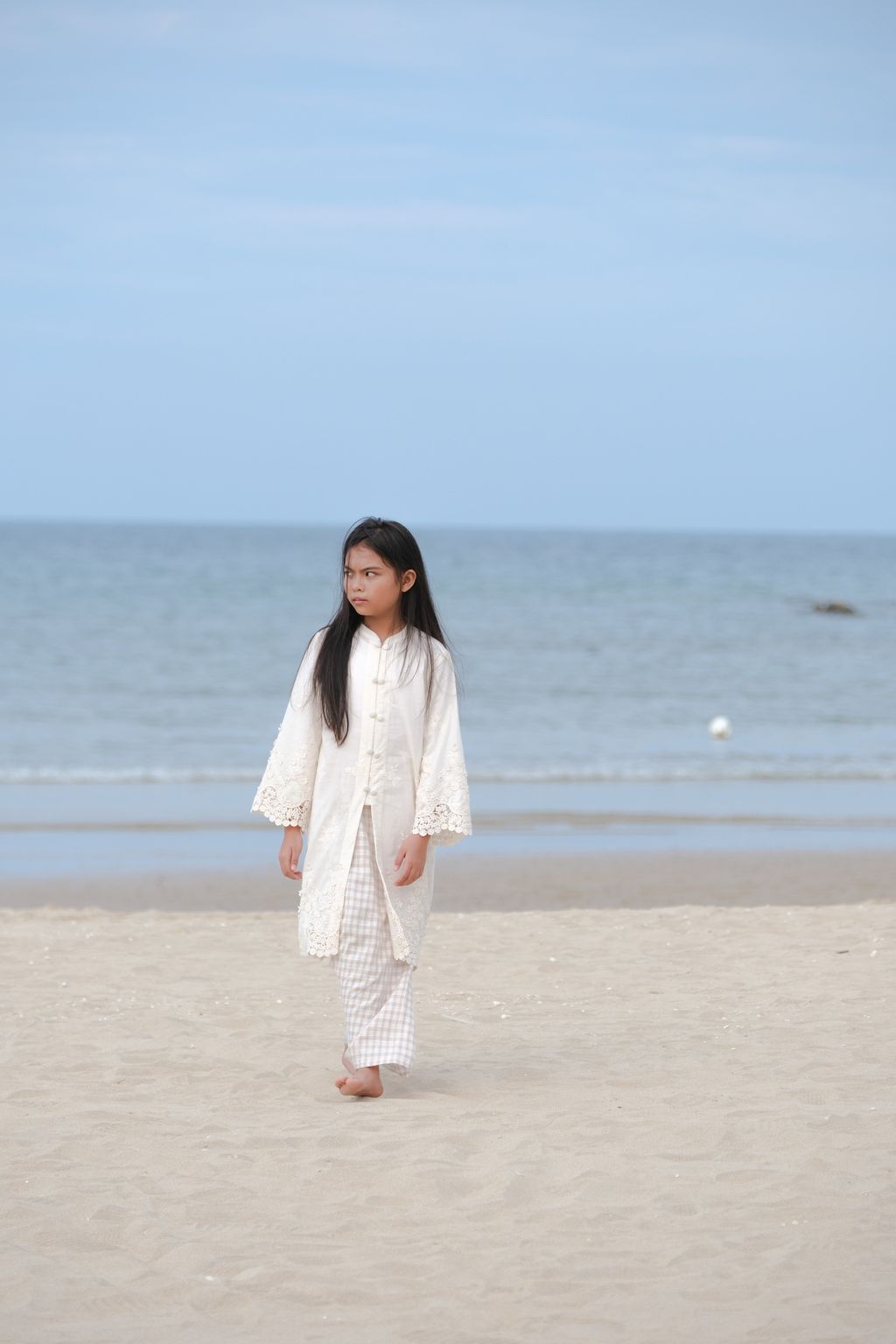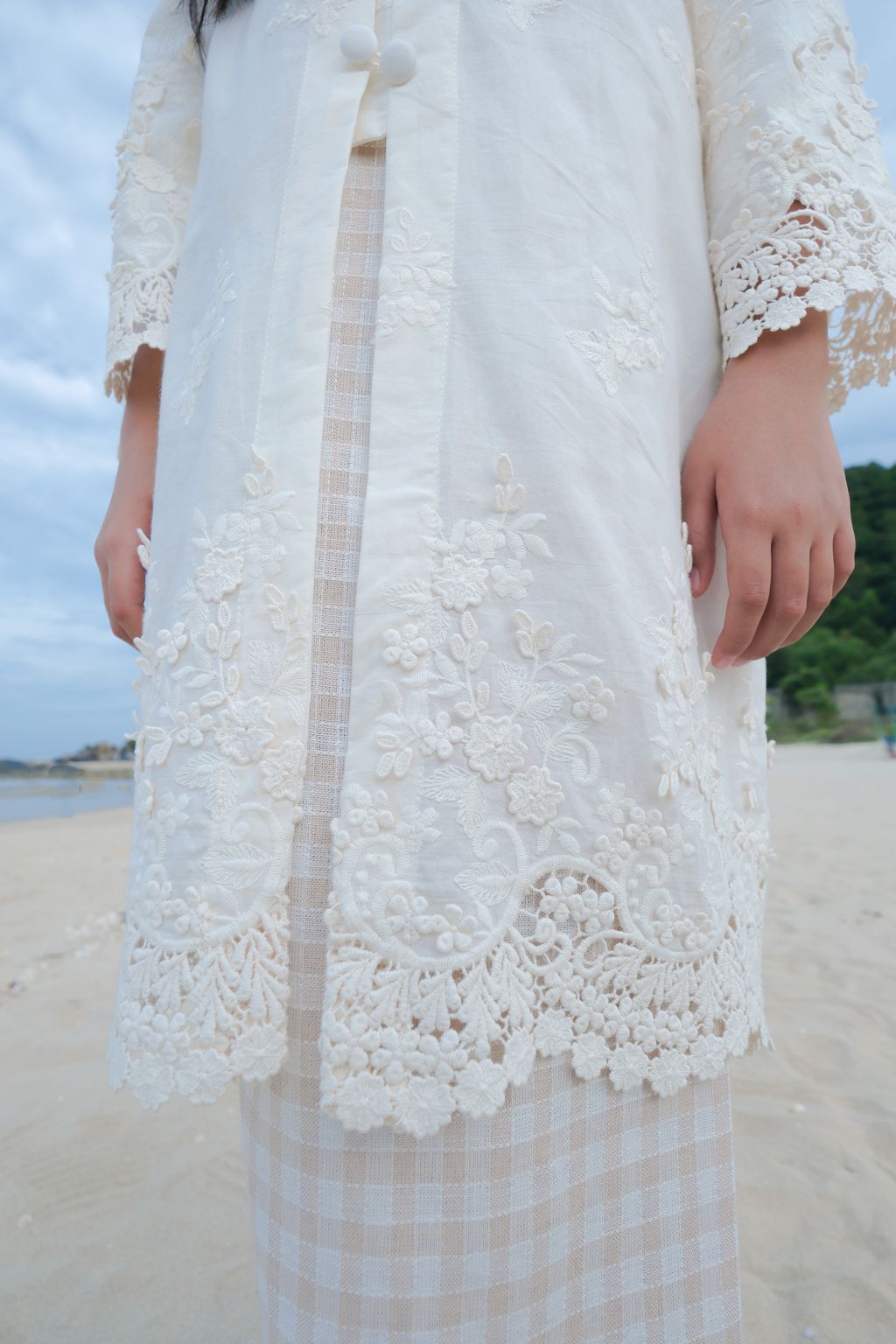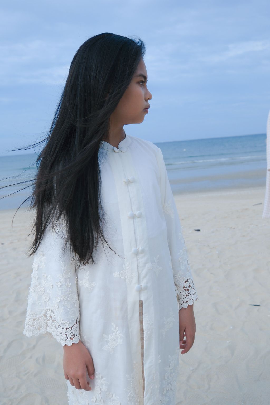 The Seri Embroidery Kebaya brings a contemporary touch to the traditional kebaya. It is designed with a loose fit to allow your little one to move freely. The detailing at the neckline features a mandarin collar design that emphasizes the kebaya's style, complemented by double-covered buttons on each buttoned section, giving the kebaya a cleaner and more appealing look. By choosing high-quality heavy 3D embroidered fabric made from pure cotton, this kebaya stands out while still maintaining a minimalist aesthetic for your cherished one.