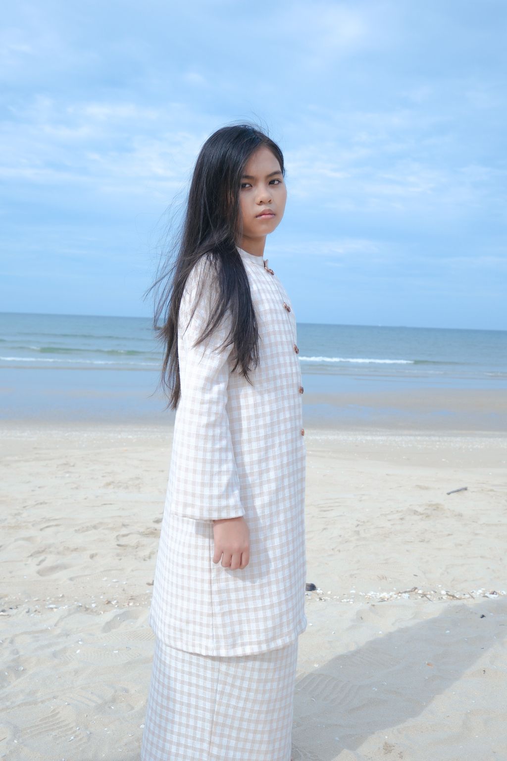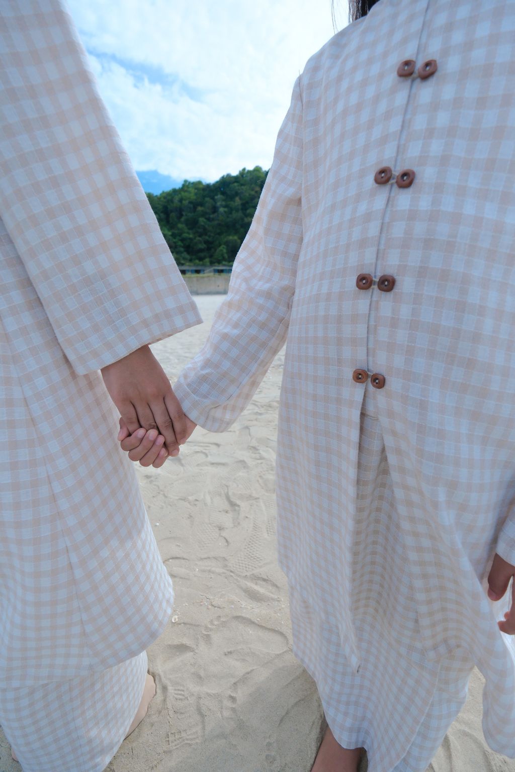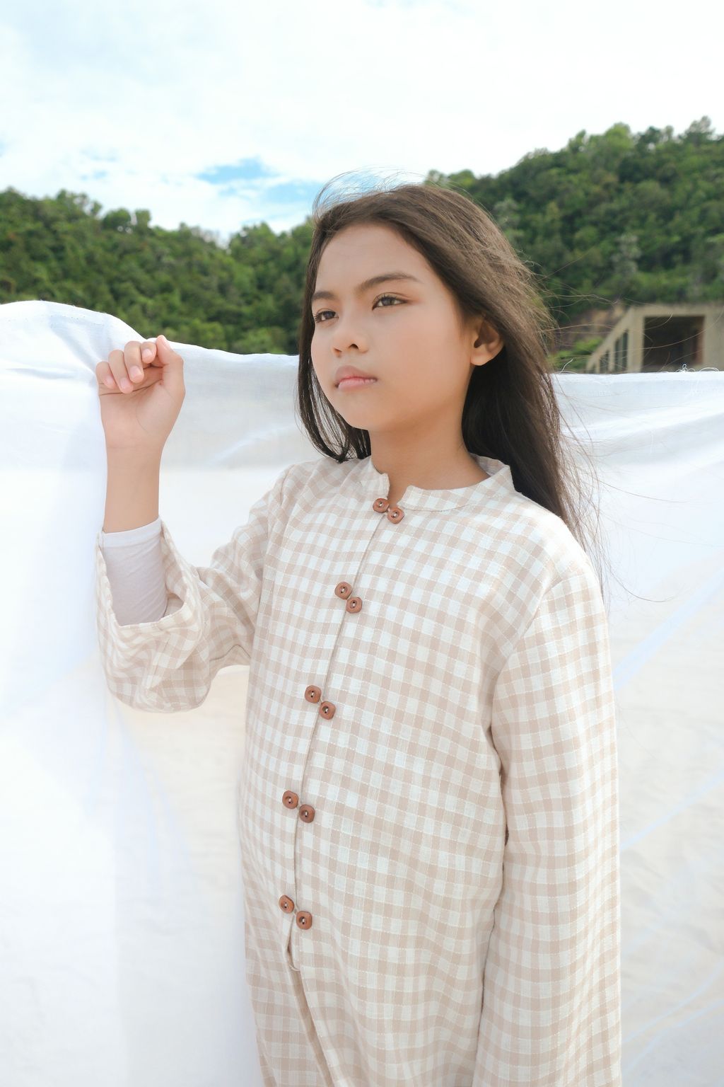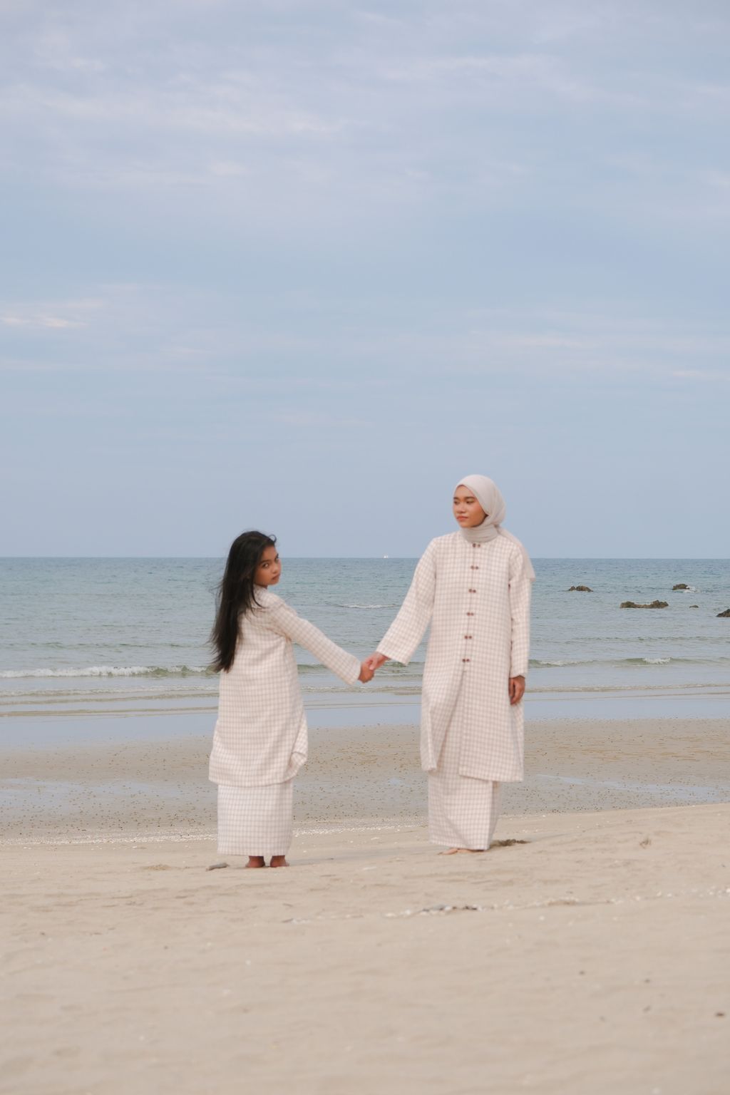 Mahrani presents a contemporary take on the traditional kebaya, infused with elegance. Designed with a loose fit, it ensures your little one experiences comfort while allowing for unrestricted movement. This kebaya boasts a sophisticated grand dad collar design, contributing a refined aspect to its overall appearance. The button-up style is beautifully enhanced by a double button feature, elevating the kebaya's charm. Meticulously crafted with premium wood buttons, every detail is thoughtfully selected. The Mahrani's fabric choice is pure linen, ensuring your little one experiences ultimate comfort. The skirt features a lipat batik (overlapped) design, imparting a timeless quality to its characteristics.