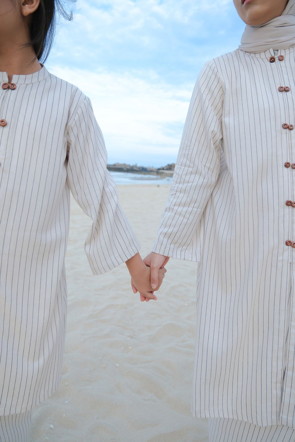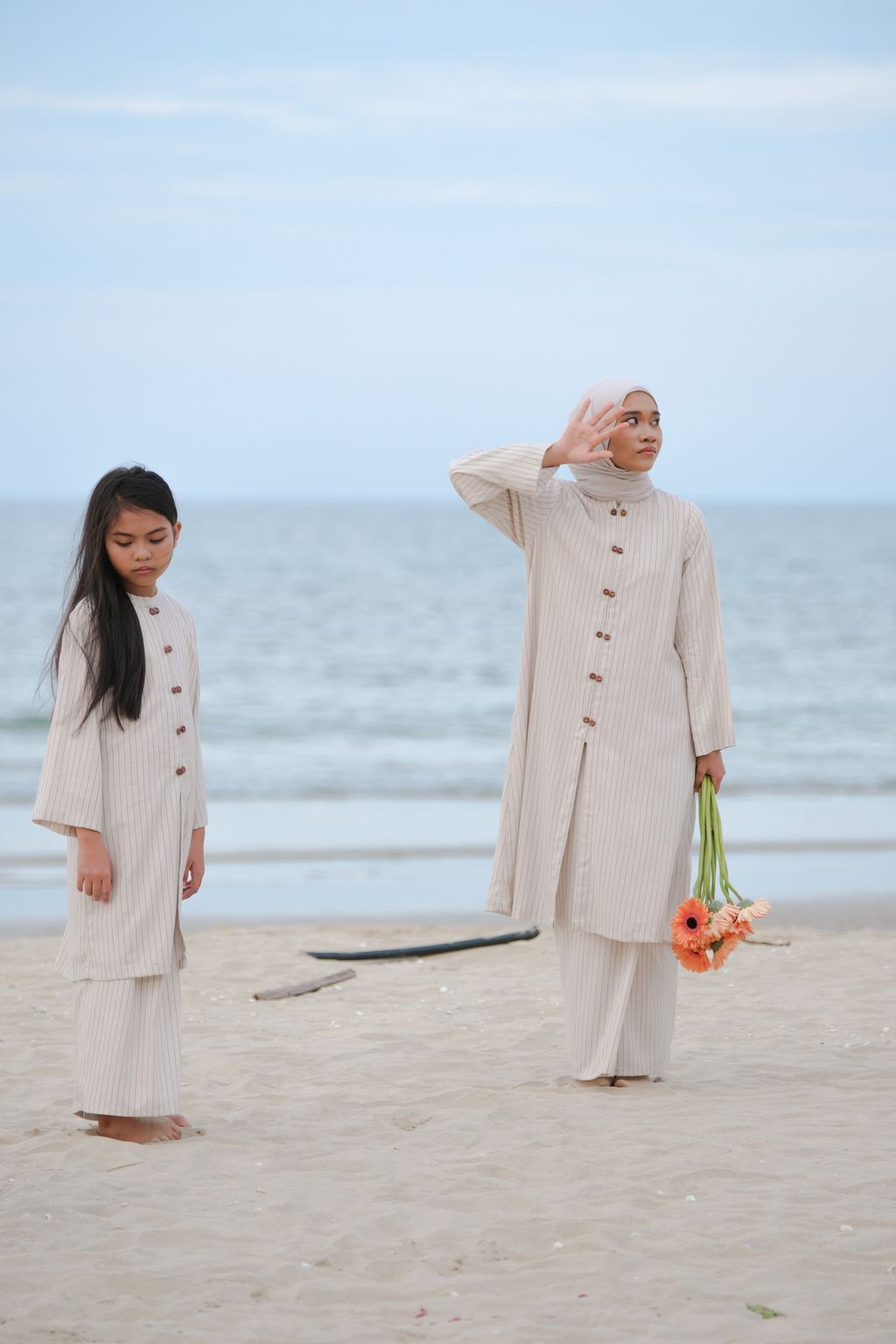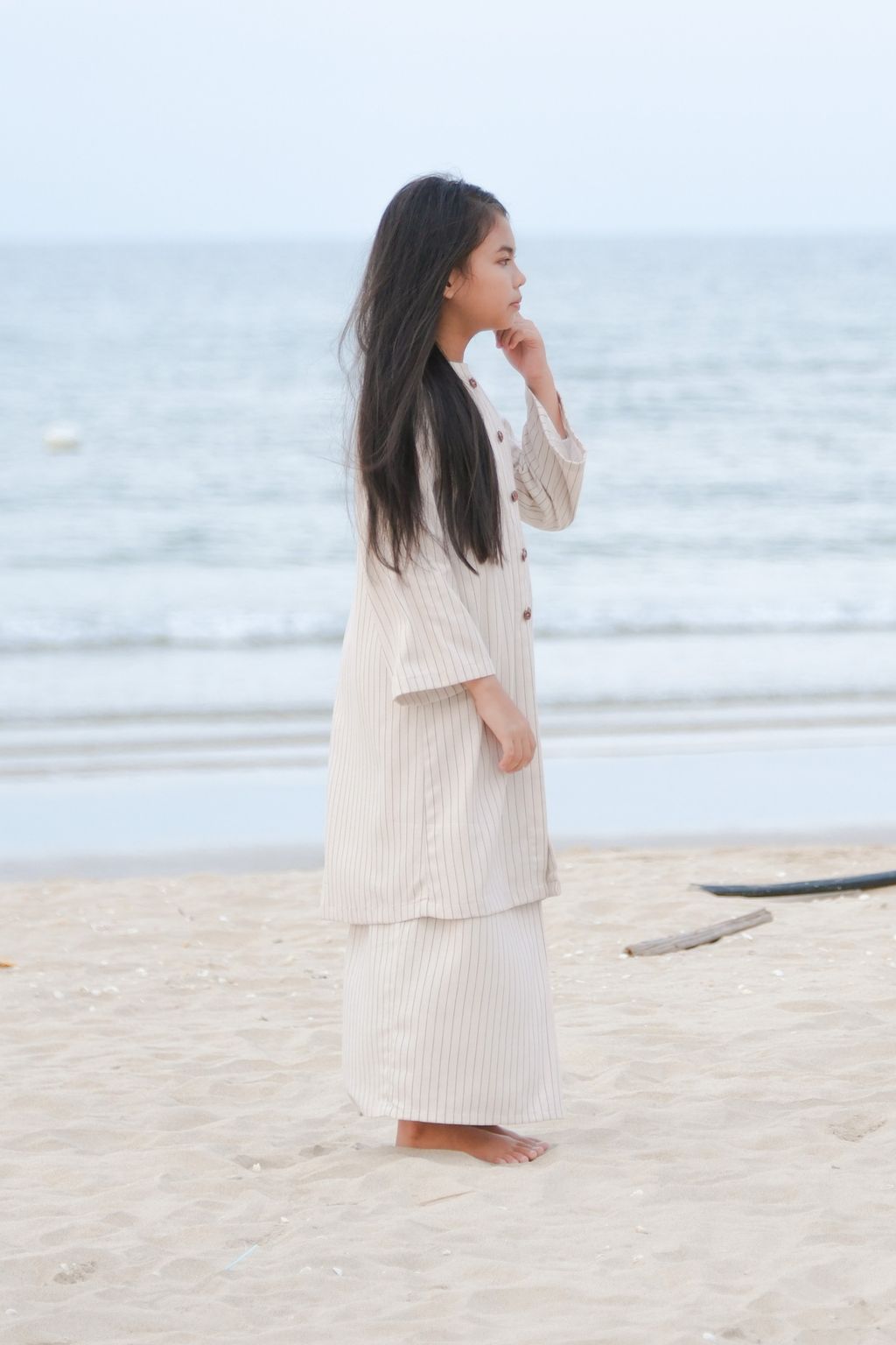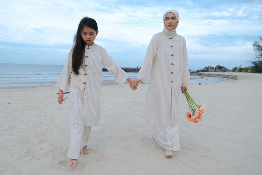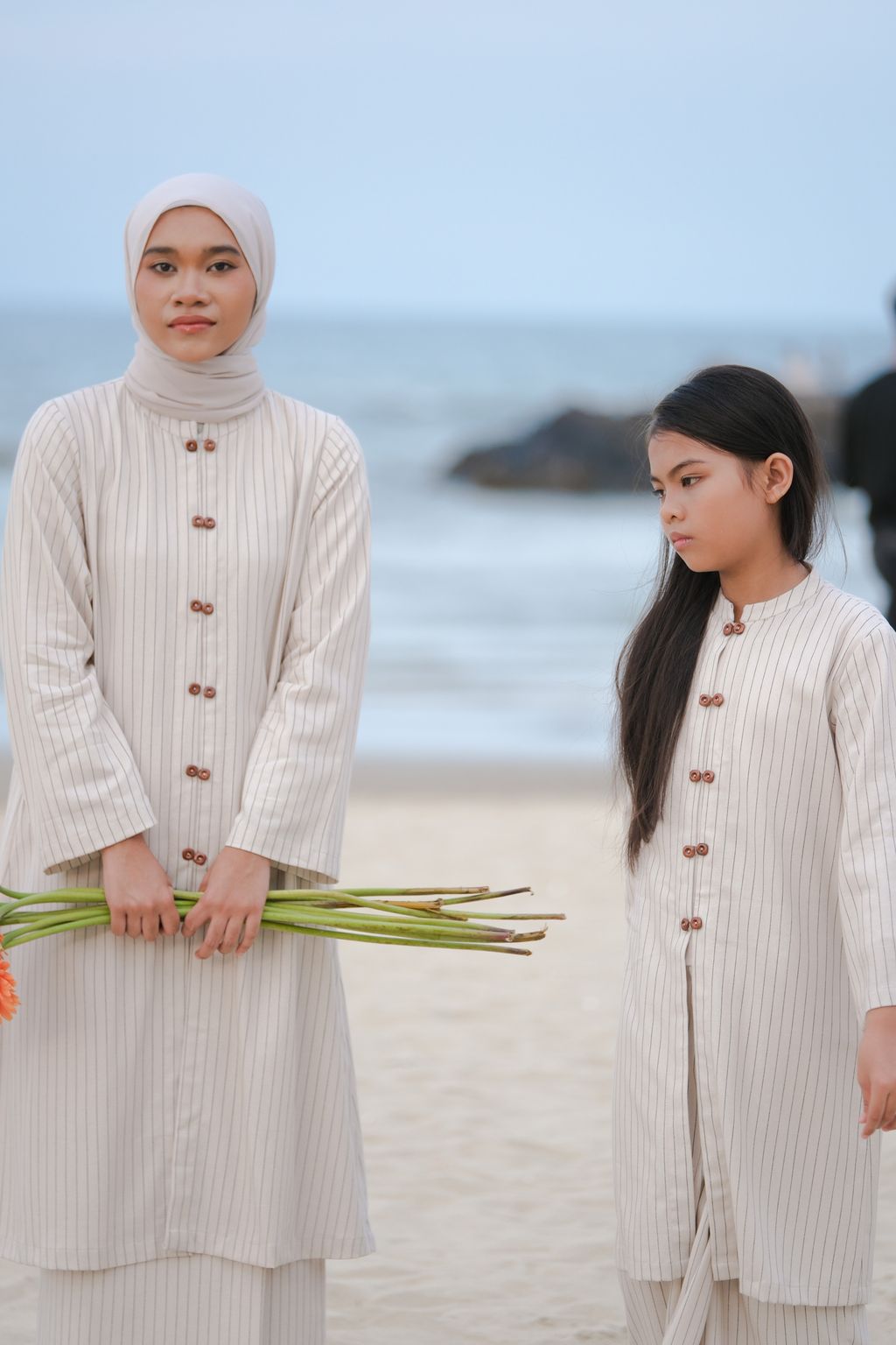 Mahrani presents a contemporary take on the traditional kebaya, infused with elegance. Designed with a loose fit, it ensures your little one experiences comfort while allowing for unrestricted movement. This kebaya boasts a sophisticated grand dad collar design, contributing a refined aspect to its overall appearance. The button-up style is beautifully enhanced by a double button feature, elevating the kebaya's charm. Meticulously crafted with premium wood buttons, every detail is thoughtfully selected. The Mahrani's fabric choice is pure linen, ensuring your little one experiences ultimate comfort. The skirt features a lipat batik (overlapped) design, imparting a timeless quality to its characteristics.