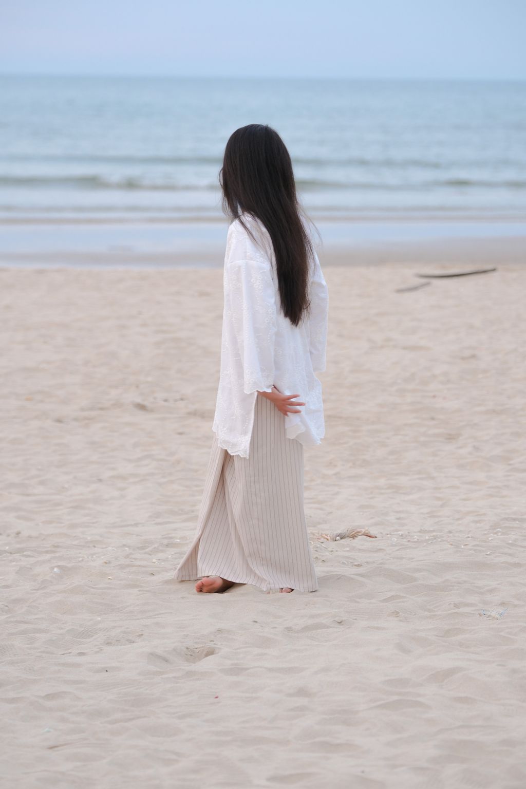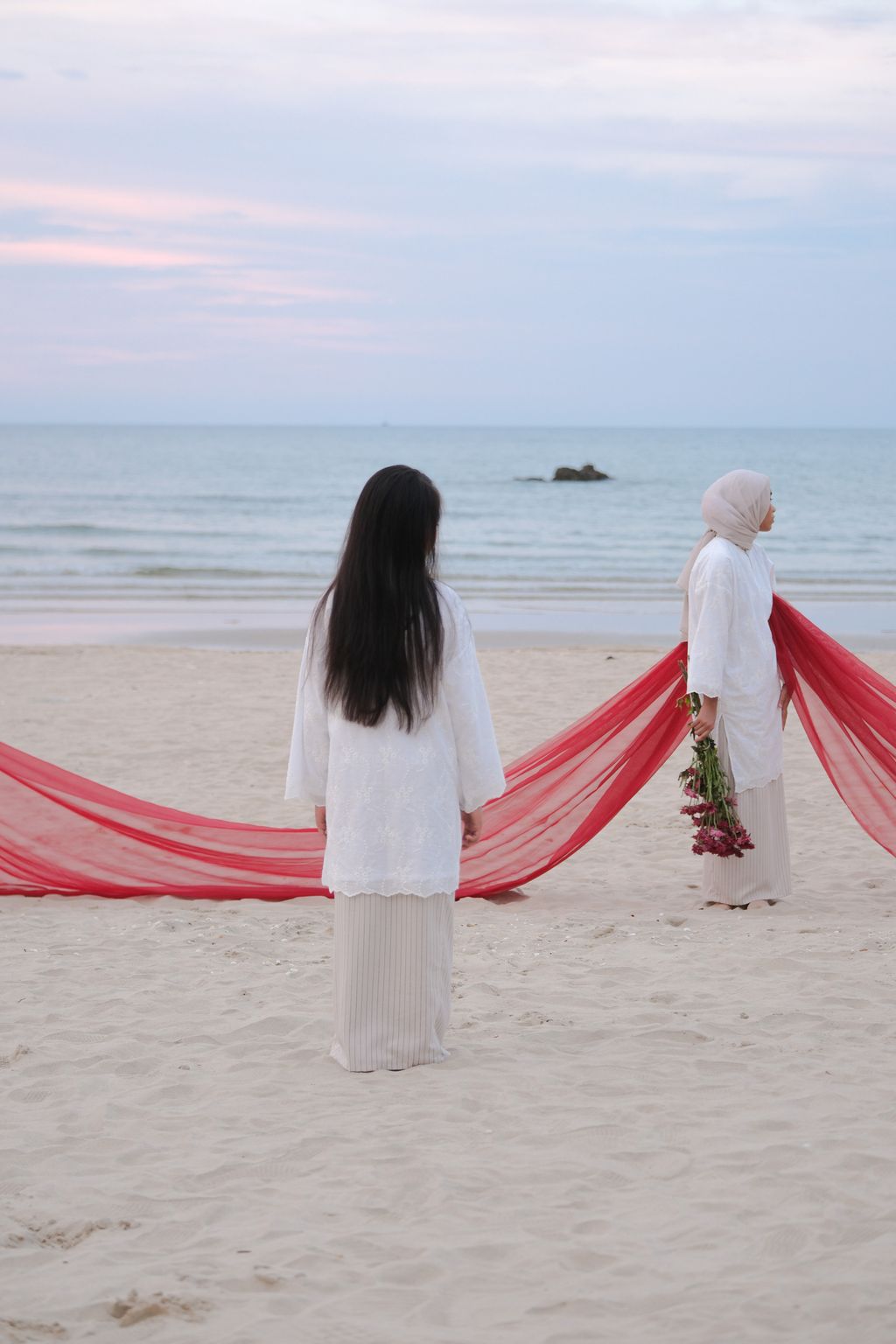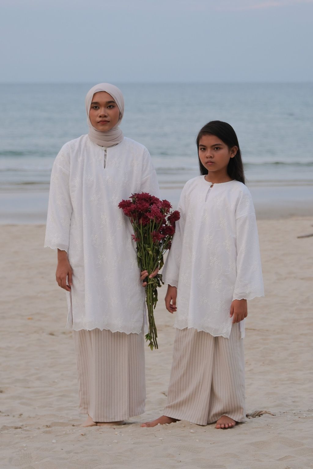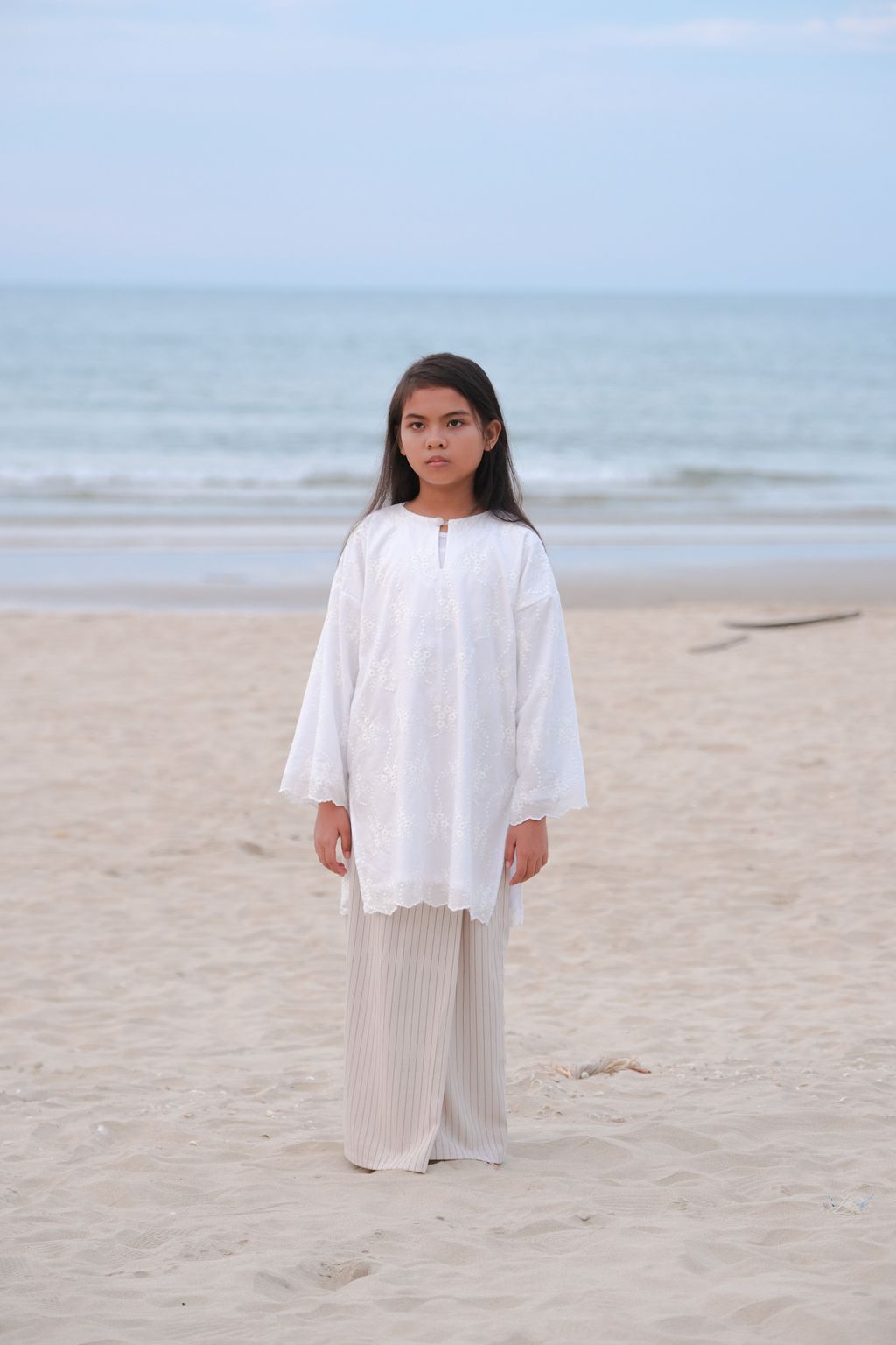 This exquisite ensemble features The Seri Embroidered Kurung in Puteh paired with The Mahrani in Nude Stripes. There are two types of this kurung; the basic one (without lining) and the exclusive version (fully lined). The top draws inspiration from the traditional kurung kedah, featuring a full-length and oversized silhouette that guarantees maximum comfort. Made from premium quality embroidery cotton, this top provides a textured touch and remarkable durability. Its round collar enhances the elegance of the overall design. To highlight its simplicity and grace, a fabric covered button has been added at the neckline, which elevates the kurung's aesthetic appeal.