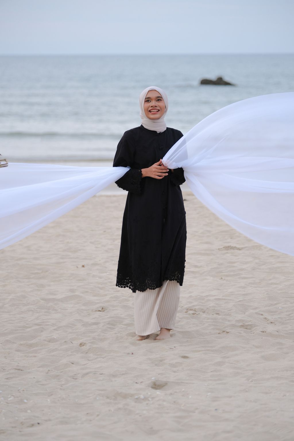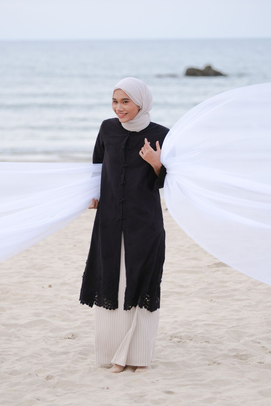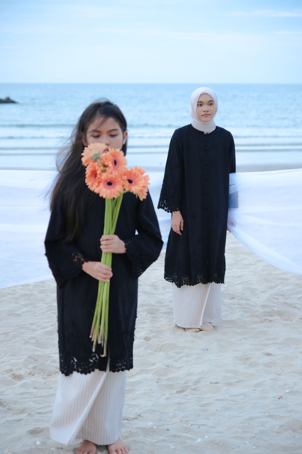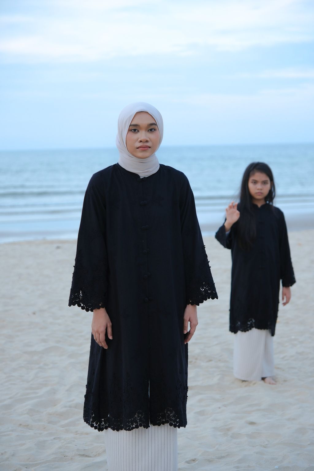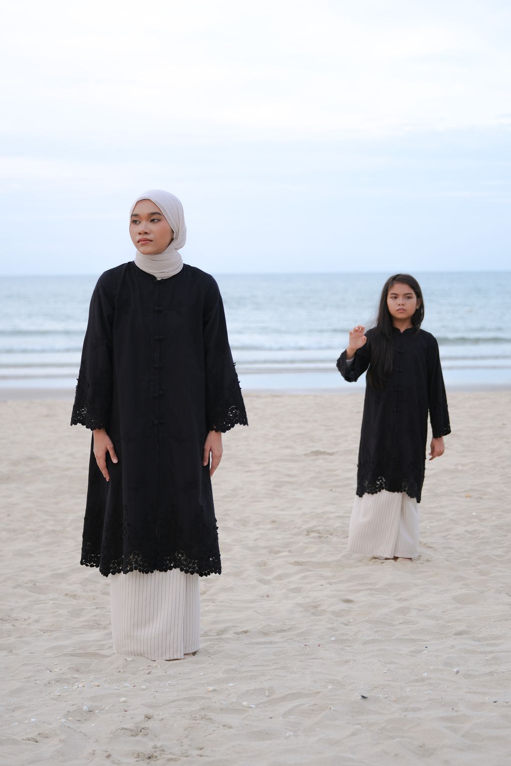 The Seri Embroidery Kebaya brings a contemporary touch to the traditional kebaya. It is designed with a loose fit to allow the wearer to move freely. The detailing at the neckline features a mandarin collar design that emphasizes the kebaya's style, complemented by double-covered buttons on each buttoned section, giving the kebaya a cleaner and more appealing look. By choosing high-quality heavy 3D embroidered fabric made from pure cotton, this kebaya stands out while still maintaining a minimalist aesthetic for the wearer.