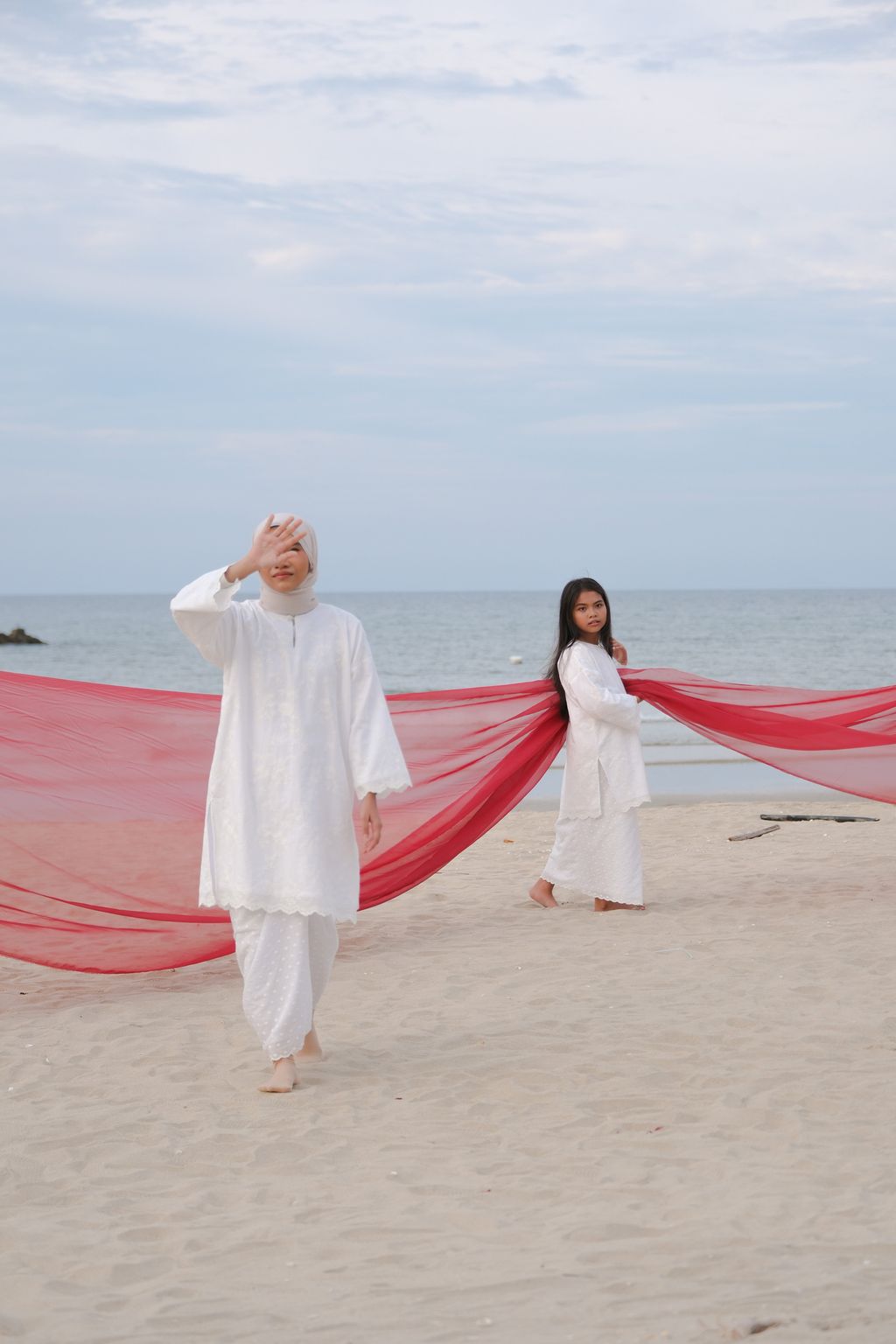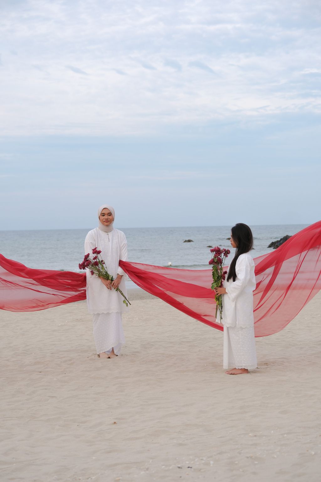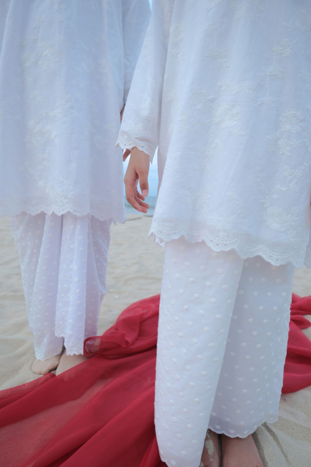 Made from premium quality embroidery cotton, this embroidered kurung provides a textured touch and remarkable durability. Its round collar enhances the elegance of the overall design. To highlight its simplicity and grace, a fabric covered button has been added at the neckline, which elevates the kurung's aesthetic appeal. The skirt of it presents two designs where one features a tie knot (wrapped) style for adults, offering a more understated and comfortable look, while the other showcases a lipat batik fold (overlapped) skirt for your adorable little one, highlighting classic elements and adding a delicate flair to the overall appearance. Embrace both comfort and elegance with The Seri Embroidered Kurung in Indah, the ideal kurung for any occasion.
