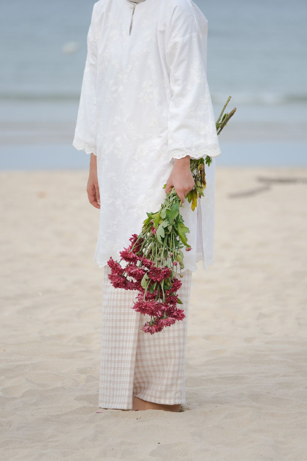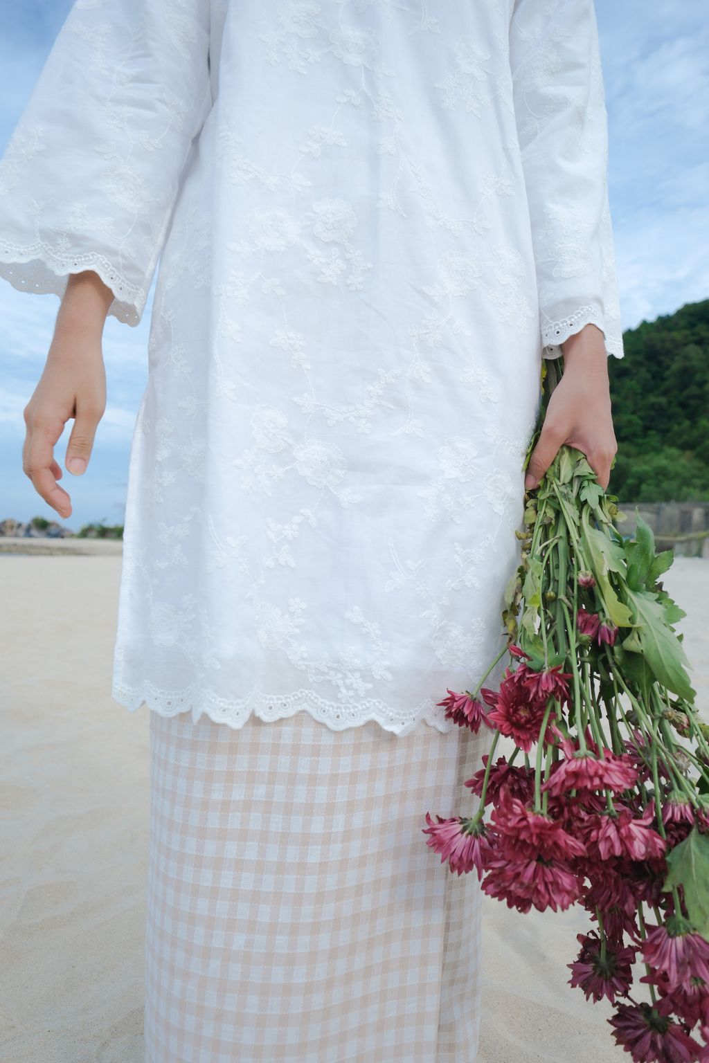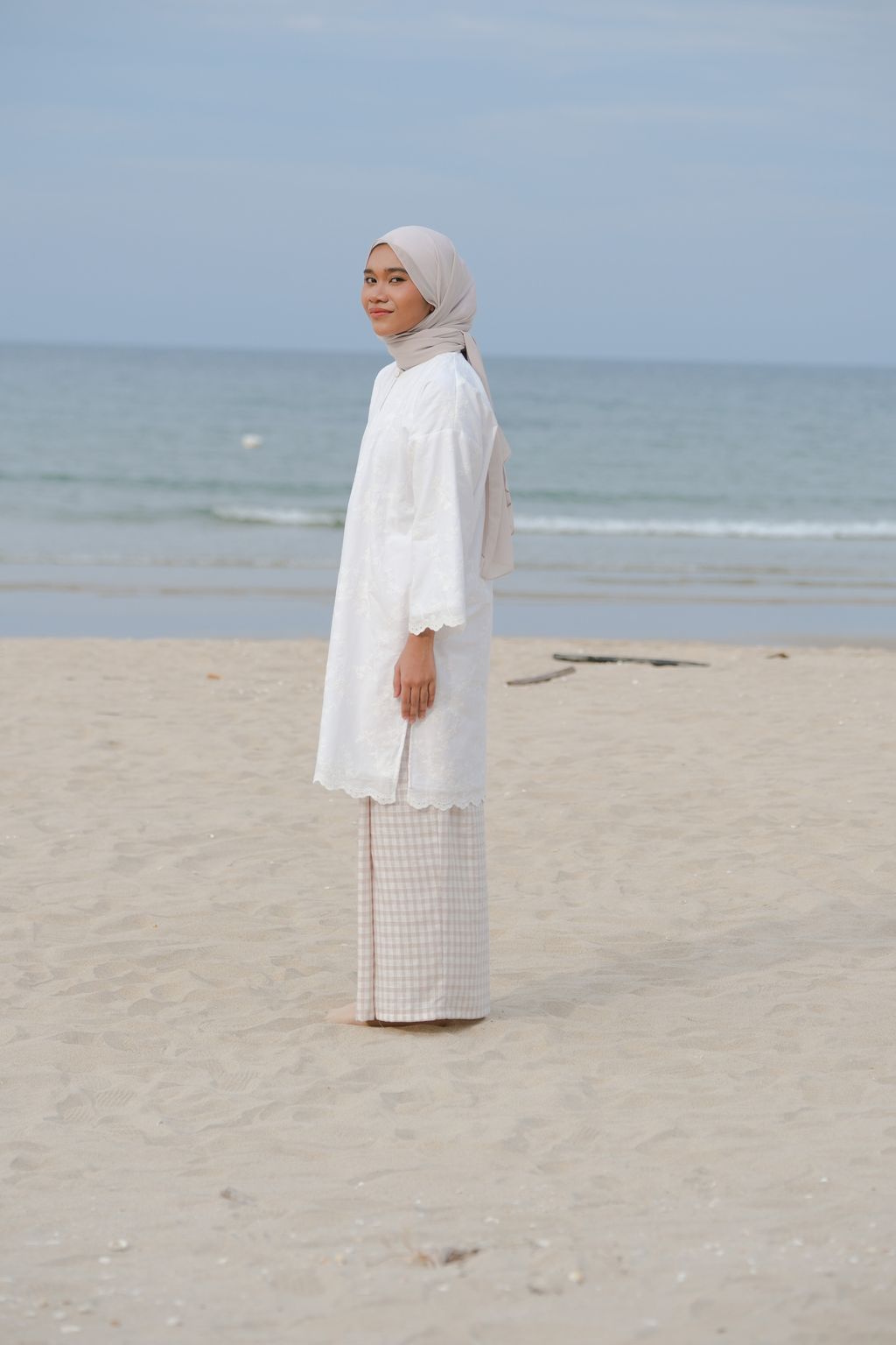 This exquisite ensemble features The Seri Embroidered Kurung in Indah paired with The Mahrani in Brown Checkered. There are two types of this kurung; the basic one (without lining) and the exclusive version (fully lined). The top draws inspiration from the traditional kurung kedah, featuring a full-length and oversized silhouette that guarantees maximum comfort. Made from premium quality embroidery cotton, it provides a textured touch and remarkable durability. Its round collar enhances the elegance of the overall design. To highlight its simplicity and grace, a fabric covered button has been added at the neckline, which elevates the kurung's aesthetic appeal.